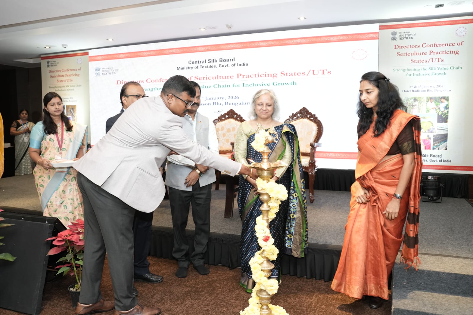 Central Silk Board (CSB), Ministry of Textiles, Government of India, organizes the Directors’ Conference of Sericulture Practicing States/UTs on January 3 and 4, 2026 at Hotel Radisson Blu, Bengaluru, under the theme “Strengthening the Silk Value Chain for Inclusive Growth.” The conference brought together senior officials from the Ministry of Textiles, State Governments, Central Silk Board institutes, and other key stakeholders to deliberate on emerging challenges, innovations and the future roadmap for India’s silk sector. P. Sivakumar, IFS, Member Secretary, Central Silk Board, set the context of the Directors’ Conference and presented an overview of the Indian silk industry, highlighting the integrated focus from seed to end product and initiatives under Silk Samagra-2.