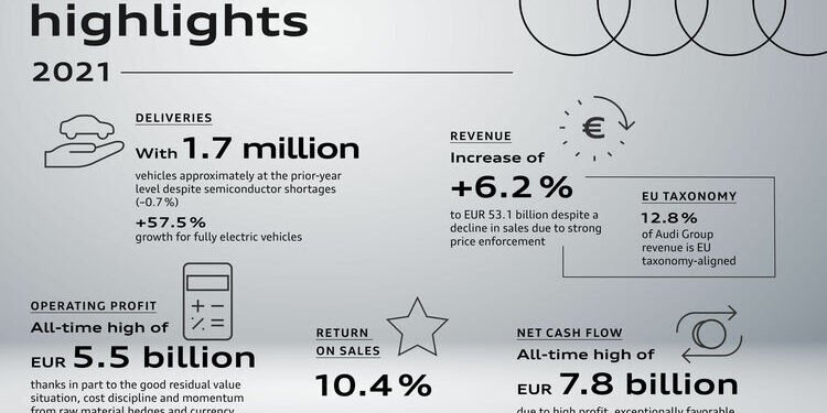 Well-filled order books and continued high demand, as well as further progress with fixed-cost discipline, give the Audi Group confidence with regard to the ongoing fiscal year. While the semiconductor supply situation should slightly improve, the concrete effects of the war in Ukraine cannot yet conclusively be estimated with regard to the global economy, the industry’s growth and the Audi Group’s earnings, finances and assets. The premium brand group’s forecast was adopted on February 21, 2022, so it doesn’t include the effects of the war in Ukraine.