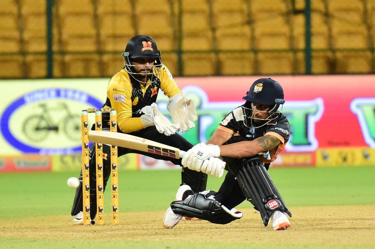 Invited to bat by Hubli Tigers’ captain Manish Pandey, the Shivamogga Lions struggled to get going as they lost openers Nihal Ullal (3) and Rohan Kadam (14) along with Rohit K (3) early and limped their way to their lowest powerplay score in this tournament, managing just 33 runs for the loss of three wickets. With the wicket gripping and the Hubli spinners making full use of the conditions, the Shivamogga batters inched their way to a total of 49-3 by the end of the 10th over. Rohan Naveen (18) soon gave in to the pressure as he hit Manvanth Kumar straight to long off, bringing Abhinav Manohar out to the crease. Skipper Shreyas Gopal (10) and Kranthi Kumar (0) were scalped off successive deliveries from leg-spinner Praveen Dubey to leave Shivamogga reeling at 59-6 after 12 overs. Manohar (10) soon fell to a slower ball for the 4th time in as many games, this time ending up as Manvanth Kumar’s third victim of the night.
