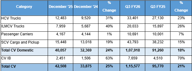 • Domestic sales of MH&ICV in December 2025 was 20,363 units vs 15,968 units in December 2024; In Q3FY26 it was 53,105 units, compared to 44,023 units in Q3FY25